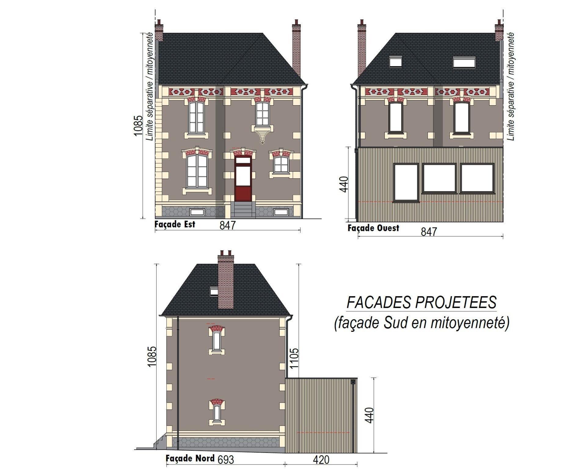 Déclaration préalable réalisée à Caen (14) pour la modification de façades d'une habitation existante située en zone SPR (Sites Patrimoniaux Remarquables) et construction d'une extension inférieure à 40m², accolée à l'habitation.